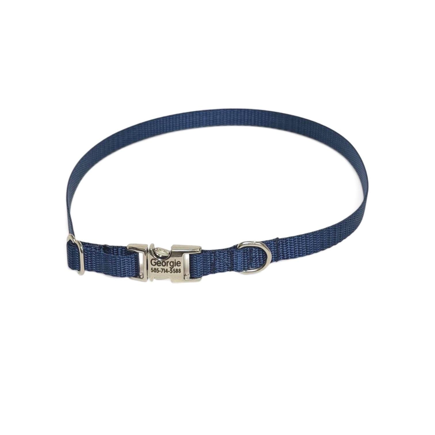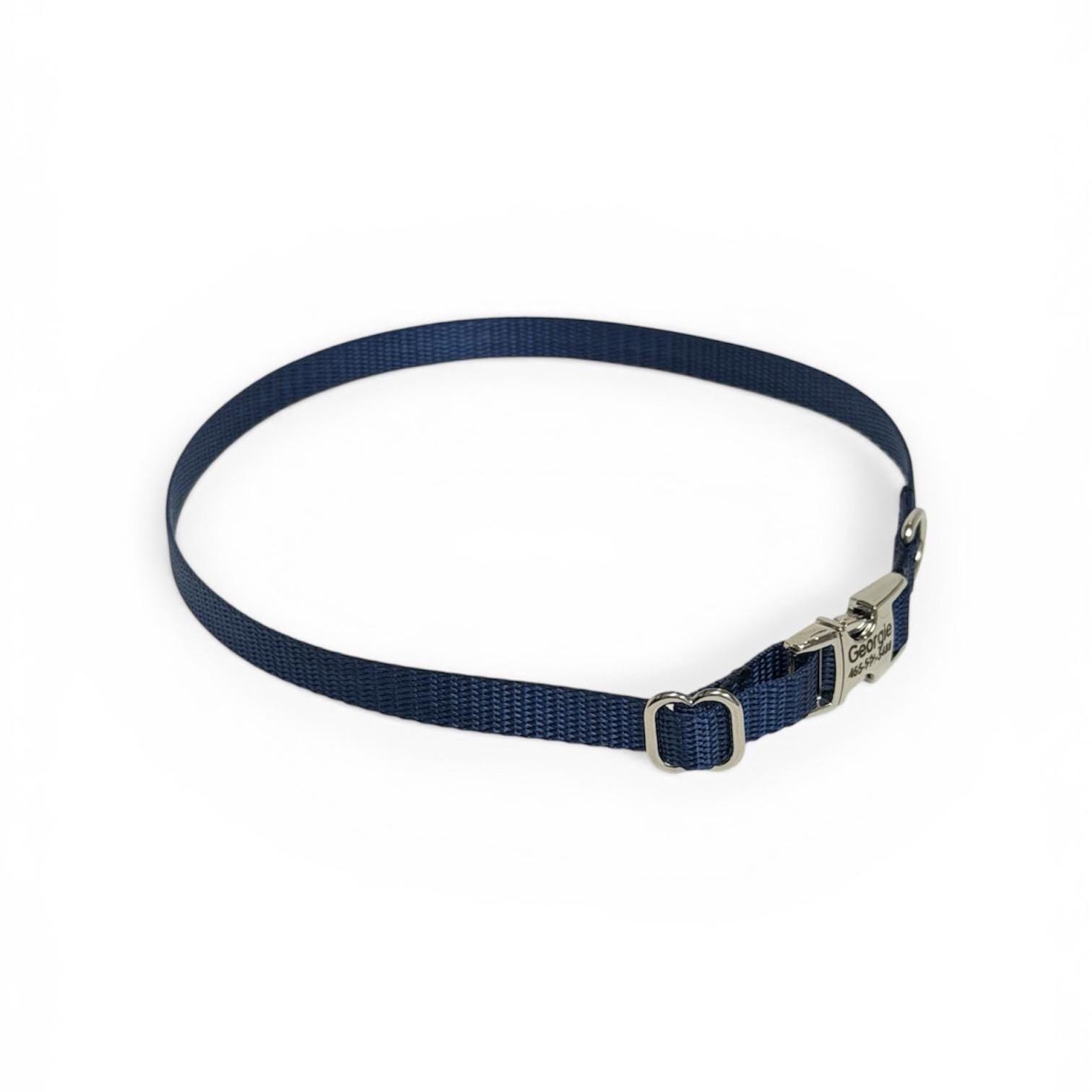Navy Dainty Personalized Nylon Dog Collar. Plastic is not personalized but being offered for those looking for something lighter.