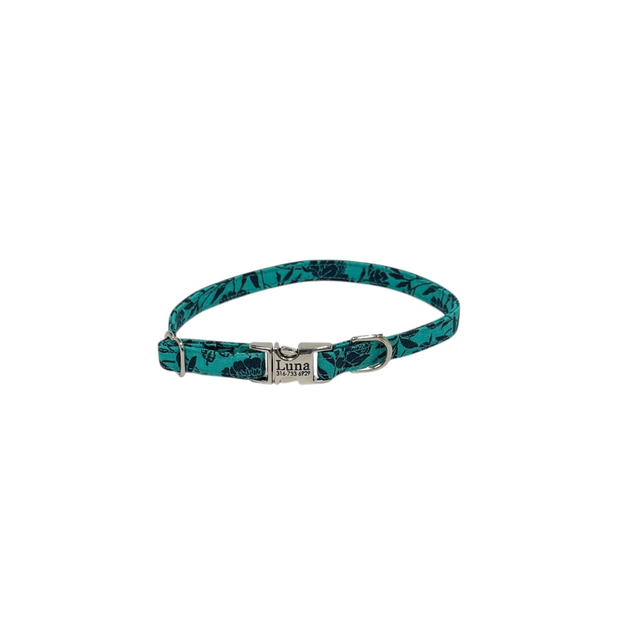NEW! 3/8" Teal Butterfly Floral Collar. Personalization optional. Ideal for tiny to small dogs. Plastic buckle now available but cannot be personalized, only our metal buckles.